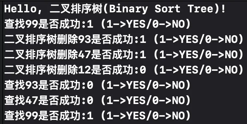 printf("二叉排序树删除93是否成功:%d (1->YES/0->NO)\n",statusValue);