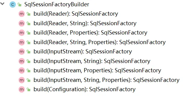 创建一个新的SqlSessionFactoryBuilder对象,这里使用了建造者模式。调用了build()方法创建了SqlSessionFactory对象,在SqlSessionFactoryBuilder中有9个重载的build()方法,可以使用不同的方式来创建SqlSessionFactory对象,其默认是单例模式的。