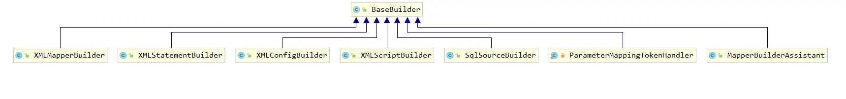 XMLConfigBuilder继承自抽象类BaseBuilder,解析全局的配置文件,BaseBuilder还有一些子类,用来创建不同的目标的。例如: