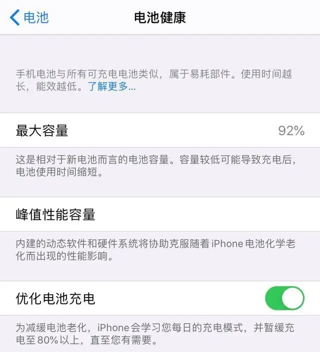 同时针对电池损耗问题,iOS13还内置了专业的电池健康功能,选择设置-电池-电池健康就可进入界面,在里面可查看电池的最大容量,也就是查看电池的损耗量。同时为了减小因电池老化对性能的影响,提供了“峰值性能容量功能”,通过软硬件的结合,优化手机的性能;而为了减缓电池老化,还提供了“优化电池充电”功能,即iPhone会学习每日的充电模式,然后进行相应优化。