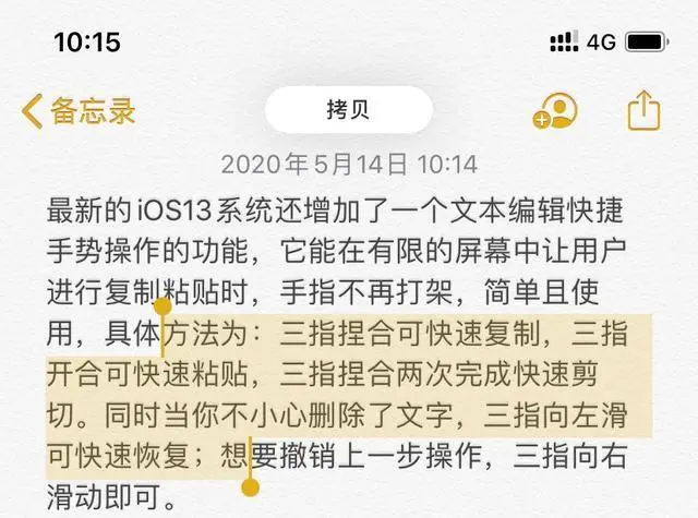 最新的iOS13系统还增加了一个文本编辑快捷手势操作的功能,它能在有限的屏幕中让用户进行复制粘贴时,手指不再打架,简单且使用,具体方法为:三指捏合可快速复制,三指开合可快速粘贴,三指捏合两次完成快速剪切。同时当你不小心删除了文字,三指向左滑可快速恢复;想要撤销上一步操作,三指向右滑动即可。