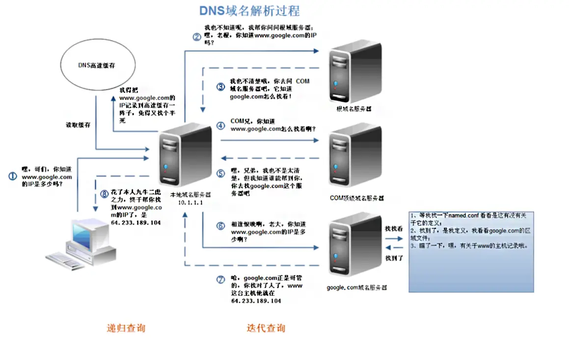 DNS域名解析采用的是递归查询的方式,过程是,先去找DNS缓存->缓存找不到就去找根域名服务器->根域名又会去找下一级,这样递归查找之后,找到了,给我们的web浏览器