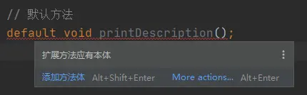 4)接口中允许定义 default 方法也是从 Java 8 开始的,比如说 printDescription(),它始终由一个代码块组成,为实现该接口而不覆盖该方法的类提供默认实现,也就是说,无法直接使用一个“;”号来结束默认方法——编译器会报错的。