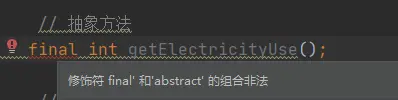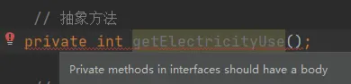 2)没有使用 private、default 或者 static 关键字修饰的方法是隐式抽象的,在编译的时候会自动加上 public abstract 修饰符。也就是说 getElectricityUse() 其实是一个抽象方法,没有方法体——这是定义接口的本意。