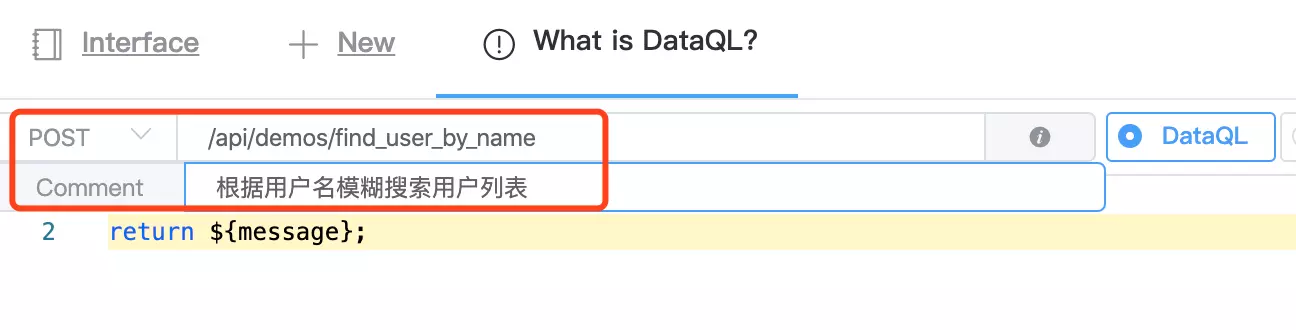 在 Dataway 中首先我们新建一个接口,并且给接口取好名字和备注。