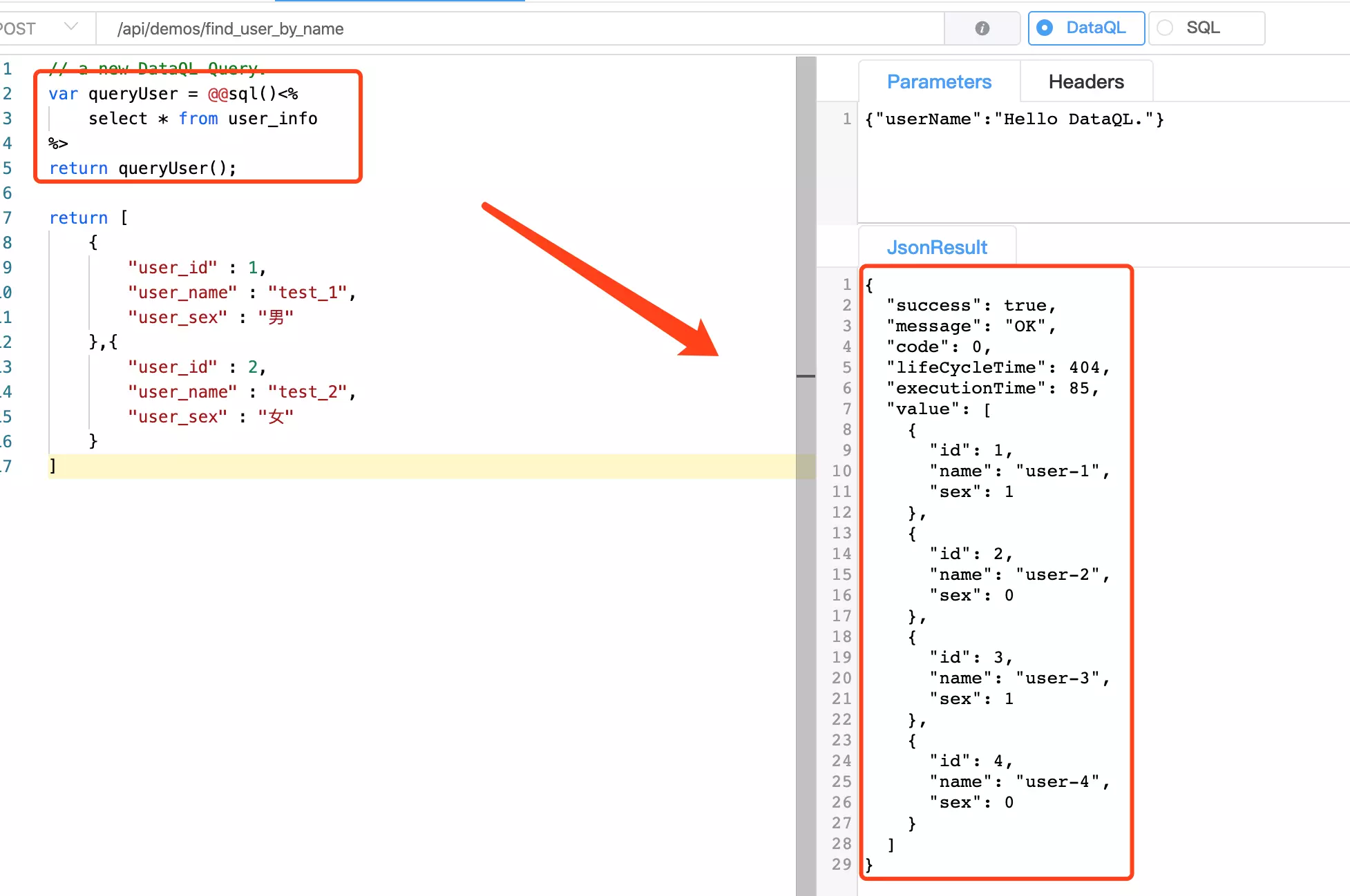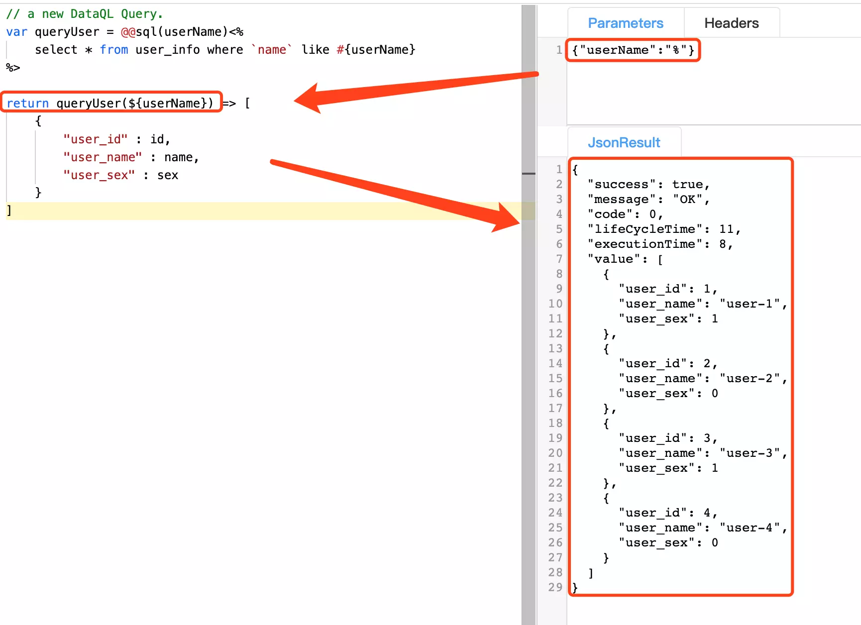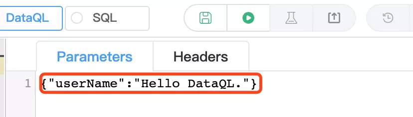 最后将前端传入的请求参数,在执行用户查询的时候将其传进去即可。在 DataQL 查询中要想获得 Paramerers 面板中定义的参数需要通过 ${ ... } 形式获取。这部分内容在官方手册上也有介绍在这里:www.hasor.net/web/dataql/…