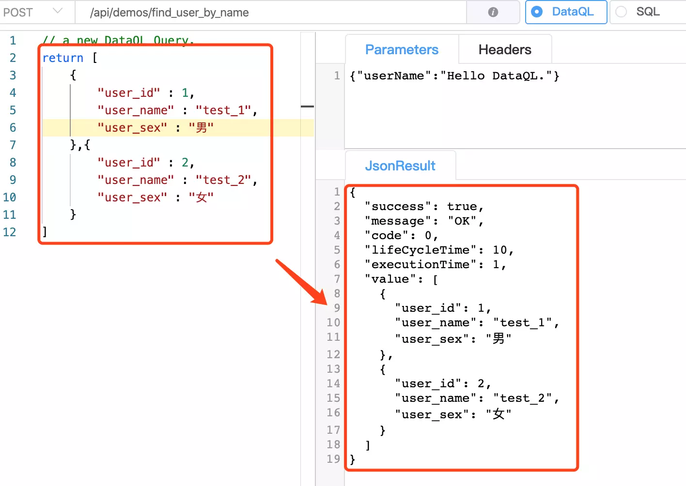 在编写SQL 之前我们先在 DataQL 上编写一段 JSON 通过这个 JSON 来模拟数据输出的结果。