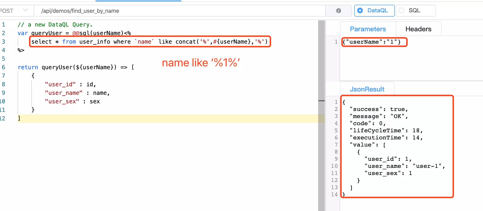 最后一部分,在 SQL 查询中使用我们预先定义好的 userName 来进行 模糊匹配。首先 SQL 语句需要有所改写: