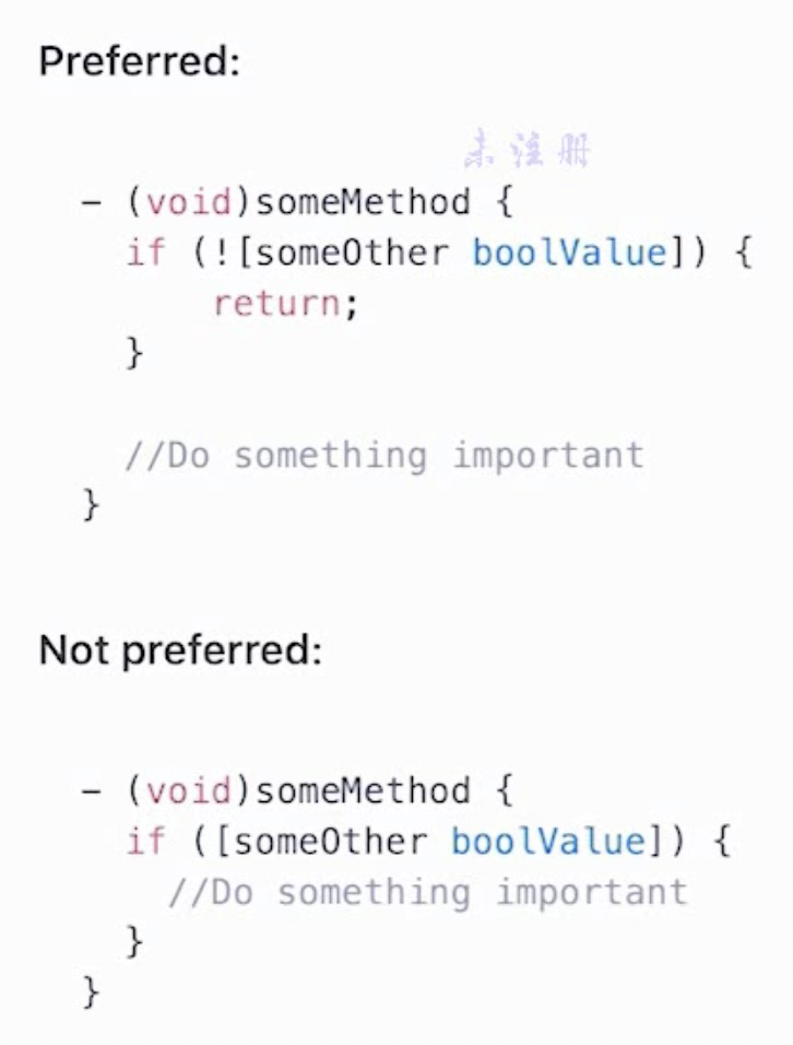 swift笔记 淡水湖 2020-05-15 128 阅读1分钟 在编写语句的时候,左边的代码间距应该是一个“黄金”或者快乐的大道。这是说,不要嵌套if语句。多个return语句是OK的。这样可以避免“圈复杂度”(Cyclomatic Complexity)。并且让代码更容易阅读。因为你的方法没有嵌套在分支上。你可以清楚地找到相关的代码。
