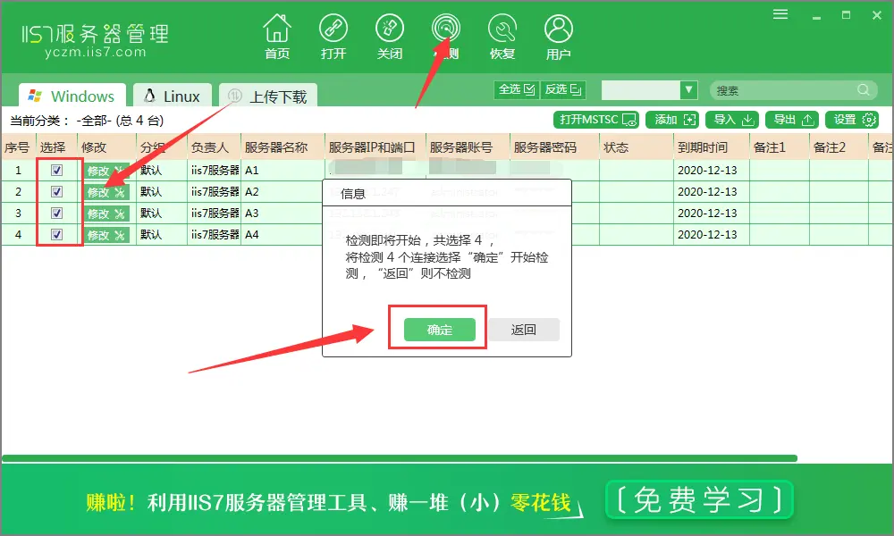 2,添加完之后,返回主界面,并选中自己需要操作的服务器,点击检测