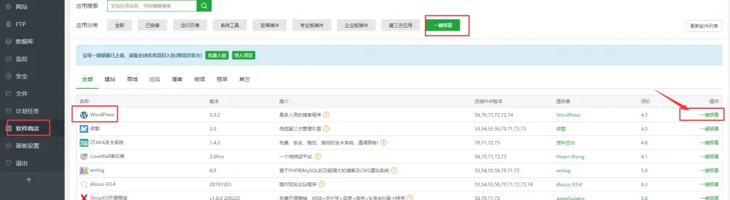 点击左侧“软件商店”,选择“一键部署”分类下的WordPress,点击最右边的“一键部署”。输入你的网站地址,就可以开始部署了(数据库名和密码自动生成,也可以自己修改)