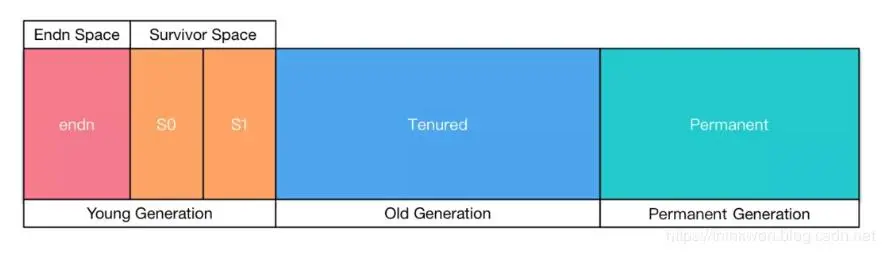 当前商业虚拟机都采用分代收集的垃圾收集算法。分代收集算法,顾名思义是根据对象的存活周期将内存划分为几块。一般包括年轻代、老年代 和 永久代,如图所示: