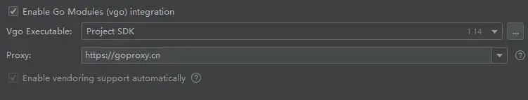 之后我们使用Goland打开该目录,进行一些配置。我们进入settings界面,在Go模块下,配置Go moudules,配置如下即可: