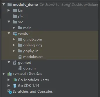 我们可以看出来新增了require模块,这里是关键引用,最后的v1.12.1就是版本号。在使用模块时,go命令将完全忽略vendor目录。为了向后兼容旧版本Go,获确保用于构建的所有文件以起存储在单个文件树中,我们可以运行go mod vendor。这样在主模块的根目录下生成一个vendor目录,并将依赖模块中的所有软件包存储在该目录中。运行执行可以看到vendor目录如下: