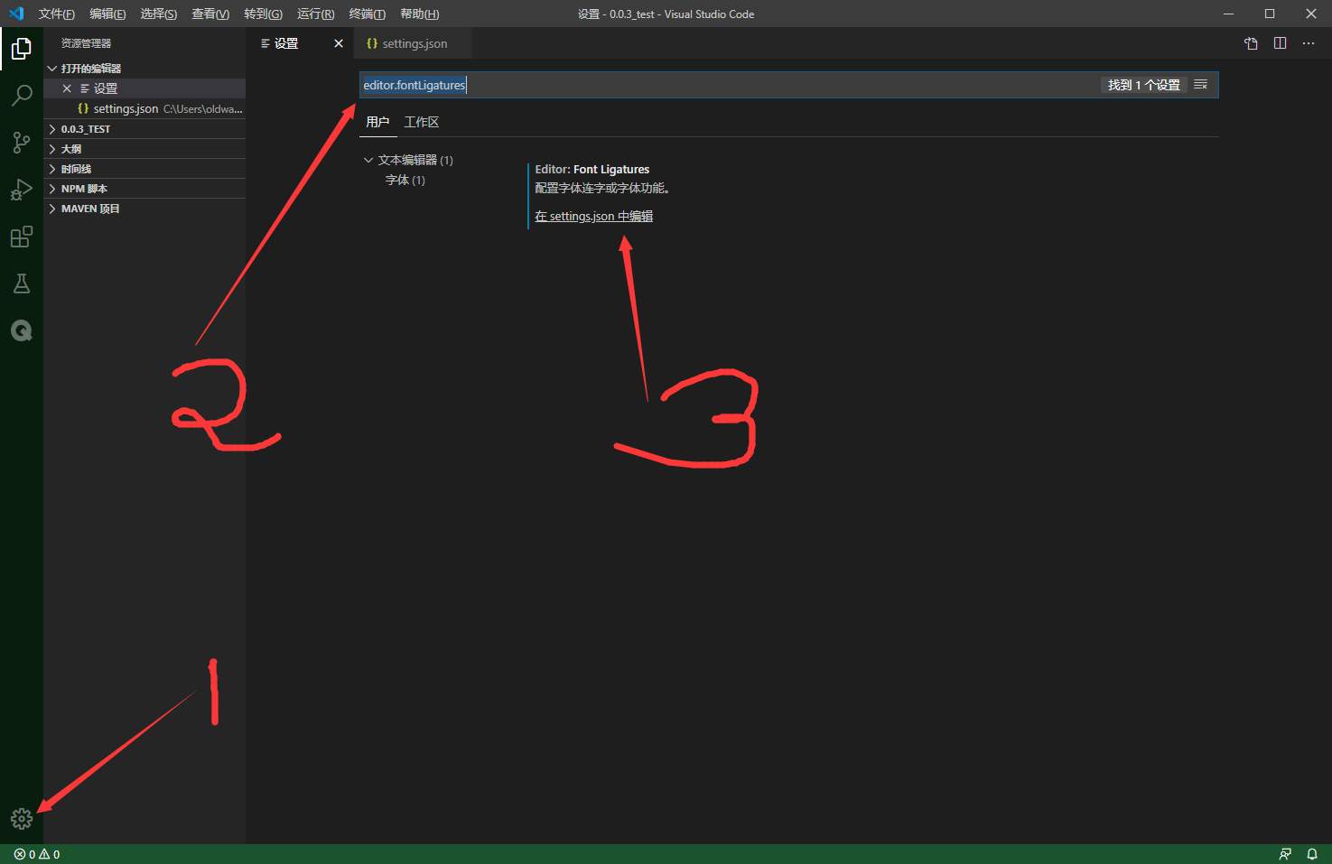 在设置中搜索 editor.fontLigatures 然后设置为 true