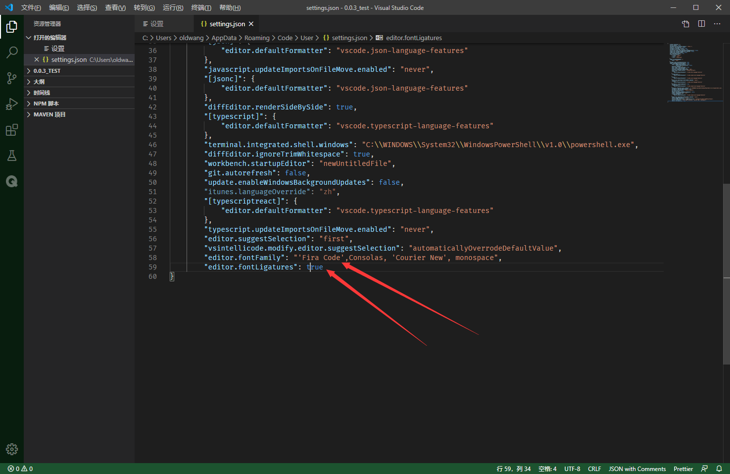 然后在 editor.fontFamily 最前面加上 'Fira Code' (别忘了单引号)