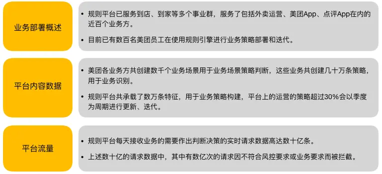 在业务发展初期,我们可以通过硬编码的方式将风控逻辑部署在业务逻辑中实现,但美团的业务比较复杂,从最初的团购形式,经过与大众点评、摩拜、猫眼等业务的融合,发展到涵盖餐饮、到店、猫眼、外卖、金融、酒店、旅游、大交通等多个垂直领域。随着业务的快速发展,适用于初期的硬编码方式出现了策略分散无法管理、逻辑同业务强耦合、策略更新迭代率受限于开发、对接成本高等多种问题。此时,我们需要有一套可配置化的规则管理平台,进而实现风控策略与业务解耦、快速部署、验证。