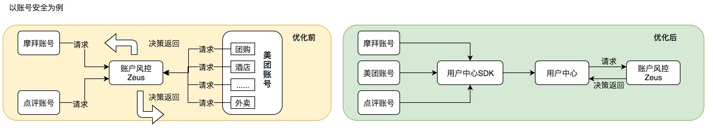 随着美团业务和场景种类的增多,现在也存在不经过通用节点的业务。因此,我们需要提供通用的接入接口,目前业务侧直接调用一个独立服务接口即可获得风控判断。