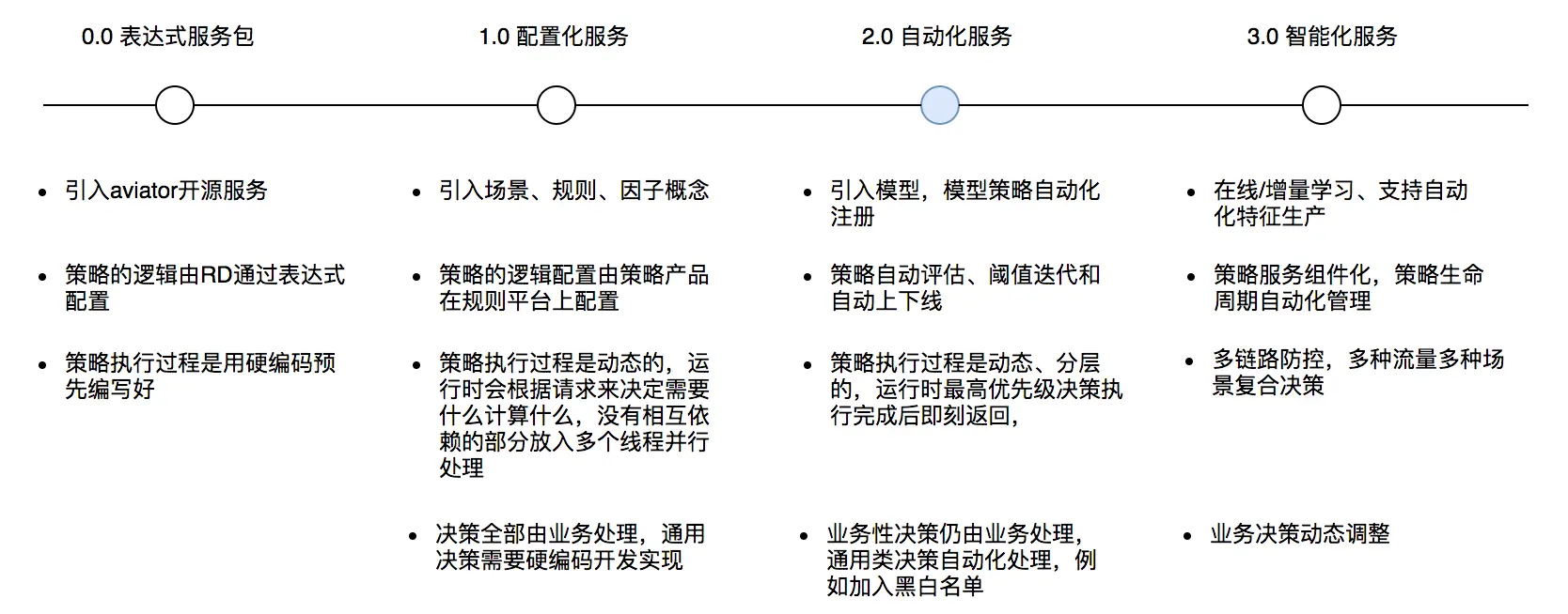 从初期主要围绕风控防控痛点进行搭建的表达式服务包,升级到配置化平台,在配置效率和执行效率也得到了很大的提升。同时,随着人工智能技术的应用和风控对抗进入白热化,规则引擎也将从配置化快速迭代至自动化、智能化。
