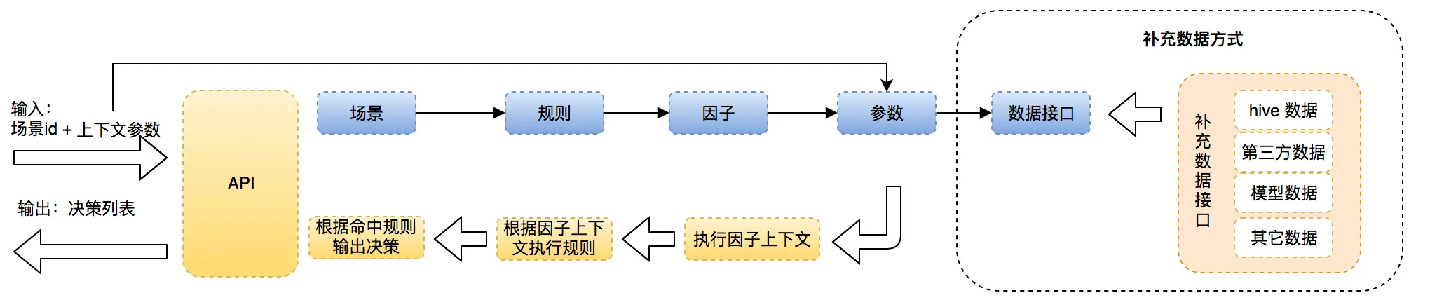 - 决策附加信息:适用于复杂决策场景Key-Value型数据,在决策中指定附加信息从而实现更多决策信息的计算及返回,比如:加入风控名单库,加入什么风险类型、风险等级、名单类型。