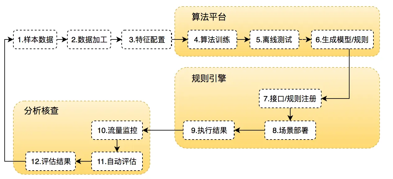 因此,仅聚焦在引擎与算法平台的联动上,可通过建设调度模块实现:1.训练样本预处理-->2.算法平台对接-->3.自动化生成接口-->4.自动注册接口/策略至引擎-->5.评估任务启动-->6.评估结果处理(策略上下线、样本数据沉淀)-->1.训练样本预处理的闭环流程。