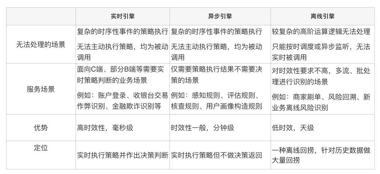 随着引擎在多业务场景的应用,我们发现几个实时引擎不好处理的场景。比如拉新场景,需要结合“注册+登陆+交易”等多种行为来判断是否有“薅羊毛”等黑灰产行为,需要将很多事件放到一起去综合判定。当发现风险时,或在当前时间点漏过的变异风险在发现之后,需要对历史数据进行回捞,这些在实时引擎中都不太好实现。当前已有的异步引擎也无法很好地进行覆盖。为了避免做“重复造轮子”的事情,团队充分地讨论了实时、异步和离线引擎的定位和服务边界。