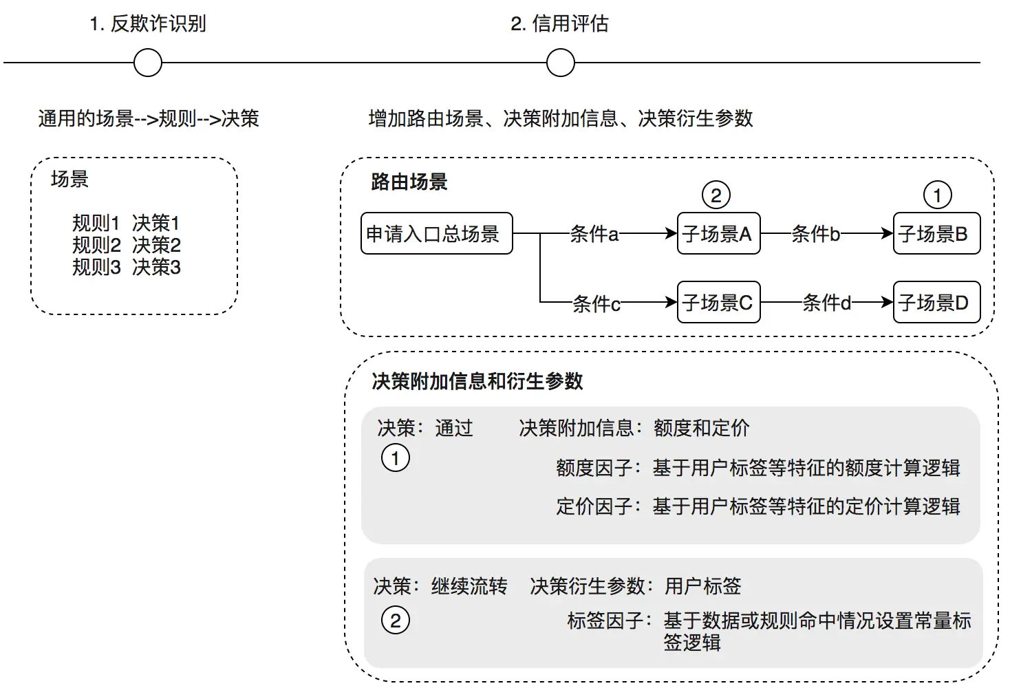- 路由场景:可支持多层,决策流模式,即一堆规则的集合,支持按照逻辑进行分流,满足指定条件可以指定走向在每个节点进行条件设置,实现最终流向。例如:对于某分期场景用户申请一笔贷款,需要经过欺诈识别、信用评估后方可给出最终的额度、定价。