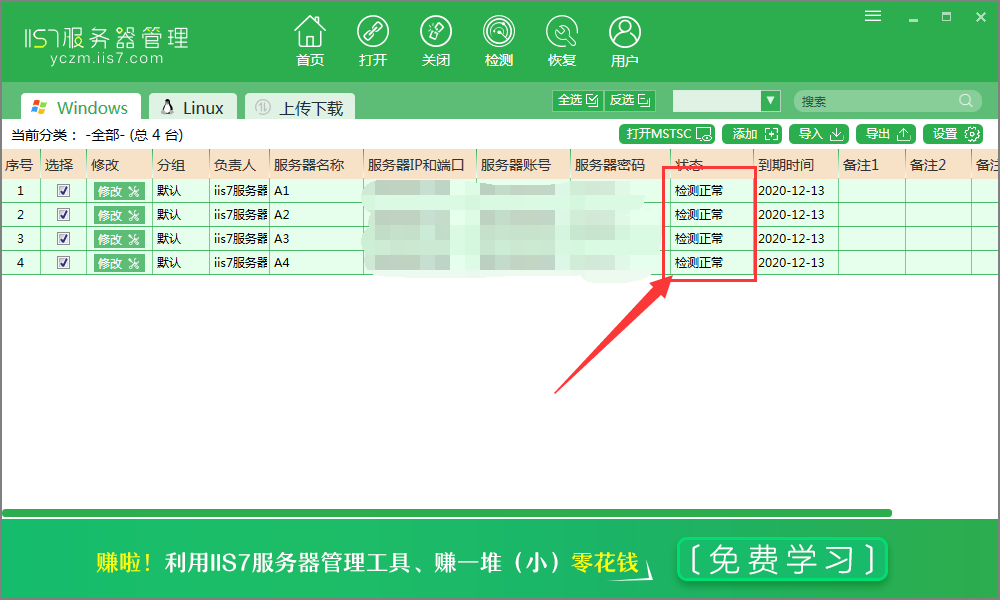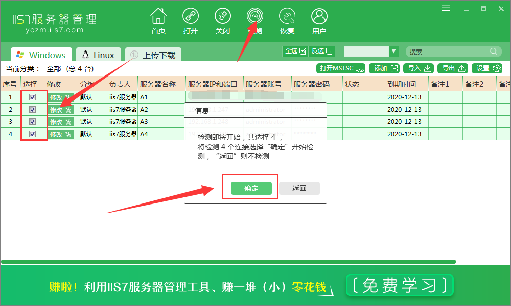 (1)打开主界面勾选中所需操作的服务器,点击检测