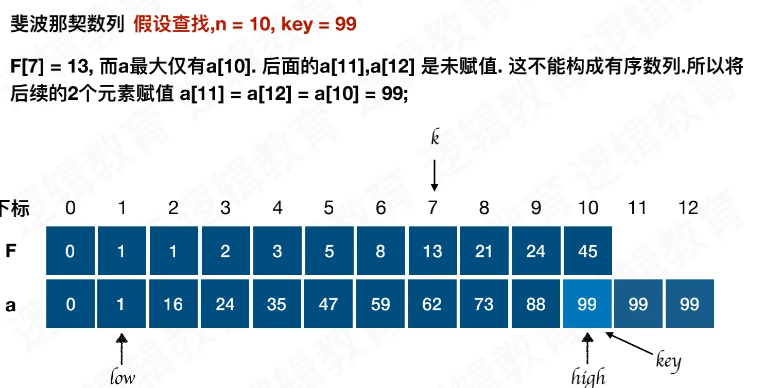 斐波拉契查找:首先找到顺序表的长度n在斐波拉契中的位置,