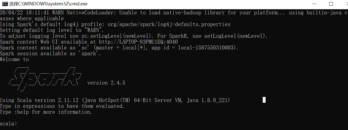 将上面spark-2.4.5-bin-hadoop2.7解压到本地,到bin目录双击spark-shell.cmd,不出意外应该会报错