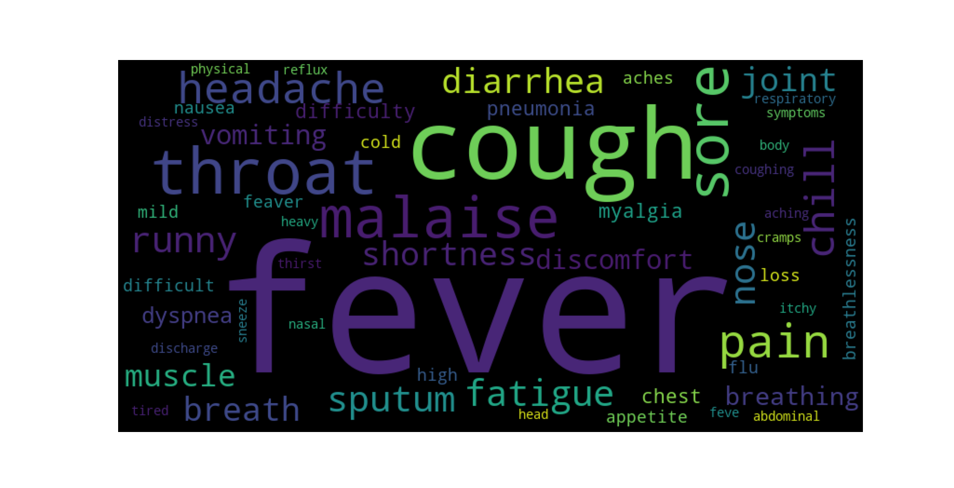 一款经典版的词云就出炉了,看上去很不错。我们的第一个问题也有了答案: fever 和cough 是最常见的症状。