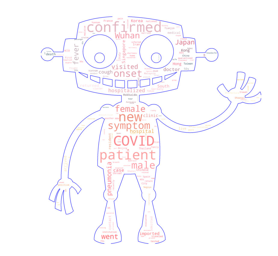 这里有一幅人类体形图,我们也可以将这些症状的词条作为tag 刻画在人物肖像上。这里需要用到wordcloud的mask 参数。mask 顾名思义就是用于掩盖一些像素。