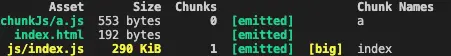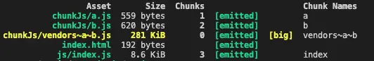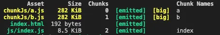 看上去的结果和initial的差不多,但还是有区别的,如果设置为all,会把静态和动态的模块代码都打包到一个chunk,这里之所以分开,是因为两个包都大于30kb,刚好命中minSize的规则。如果两个包的体积都小于30kb,那么他们将被打包成一个文件,此处不再演示,有兴趣的朋友自己试一下。