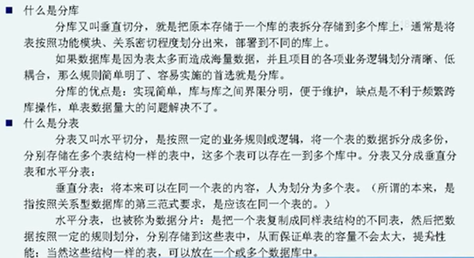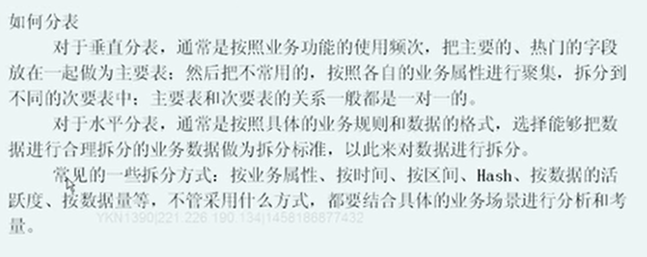 垂直分表: 将一个表按照字段访问的频次分到多个表中,可以是一个或多个数据库(分的是字段) 水平分表: 将一个表按照数据分到多个表中,可以是一个或多个数据库(分的是数据)