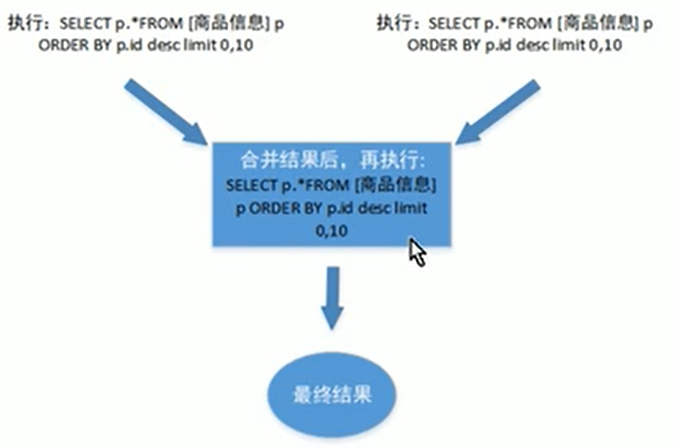 水平分库:把不同数据分到不同数据库中(商品表分成两个类型一样的表分到不同数据库中)