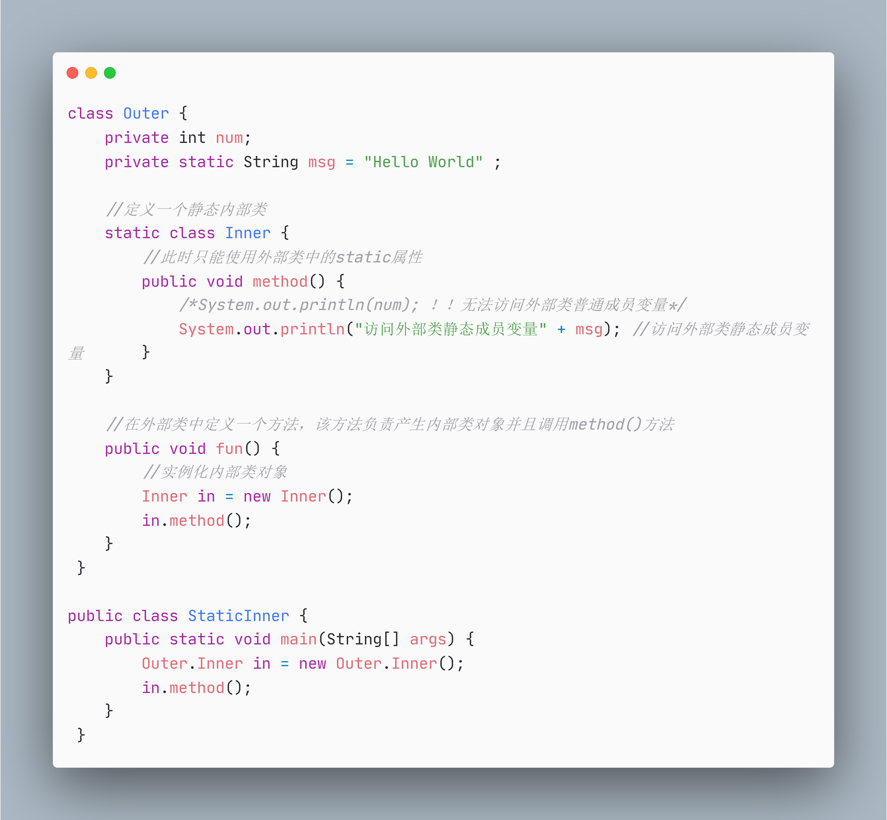 // 静态内部类只能访问外部类的静态成员(包括静态变量和静态方法)