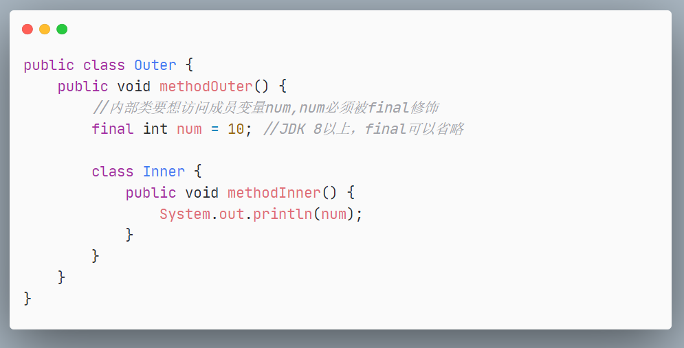 局部內部类,如果希望访问所在方法的局部变量,那么这个局部变量必须是【有效 final的】
