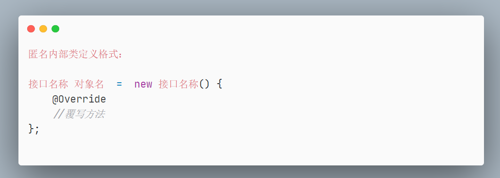 但是,有的时候我们的实现类只会使用一次,像上面定义又比较繁琐,必须得有接口的实现类才可以实例化来使用,这时我们可以使用匿名内部类。