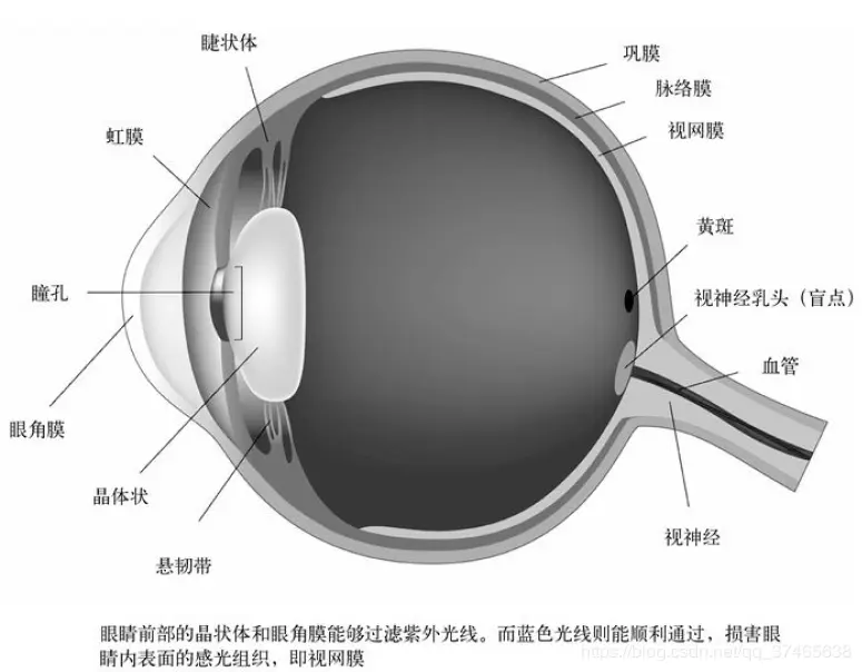 你的显示屏颜色是红色为主还是蓝色?这与蓝色光线中那些较短的光波(400~470纳米)有关,它们的数值已经非常接近紫外线的数值了。人眼的晶状体和眼角膜——我们会在下面的插图标出这两个结构的位置——能过滤紫外线,而蓝色光线则能顺利通过,因此对视网膜危害极大。