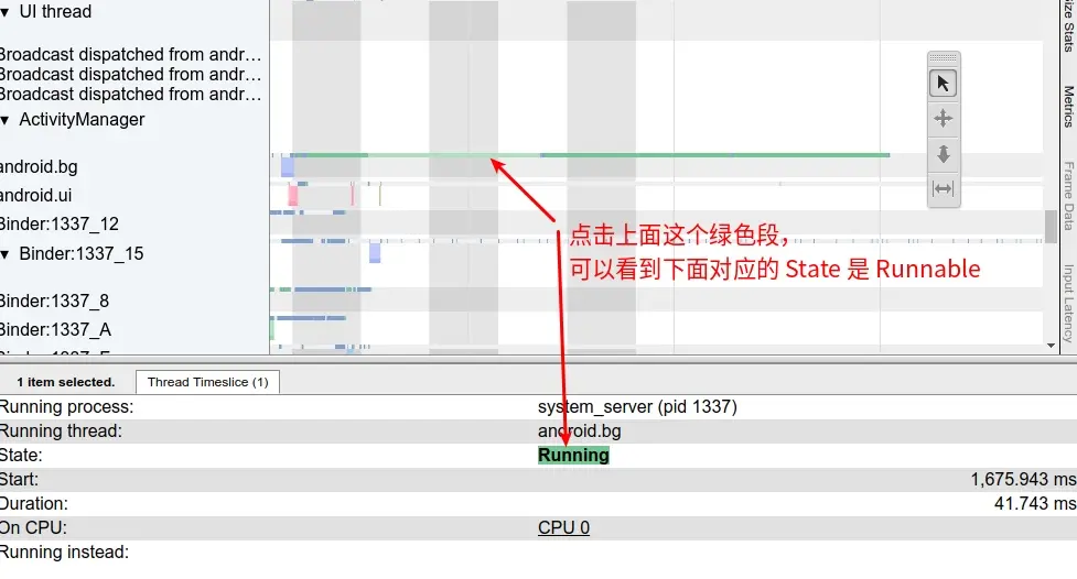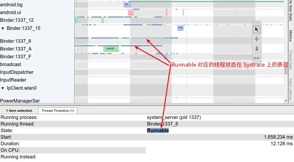 Systrace 可以标示出这个的一个原因是,一个任务在进入 Running 状态之前,会先进入 Runnable 状态进行等待,而 Systrace 会把这个状态也标示在 Systrace 上(非常短,需要放大进行看)