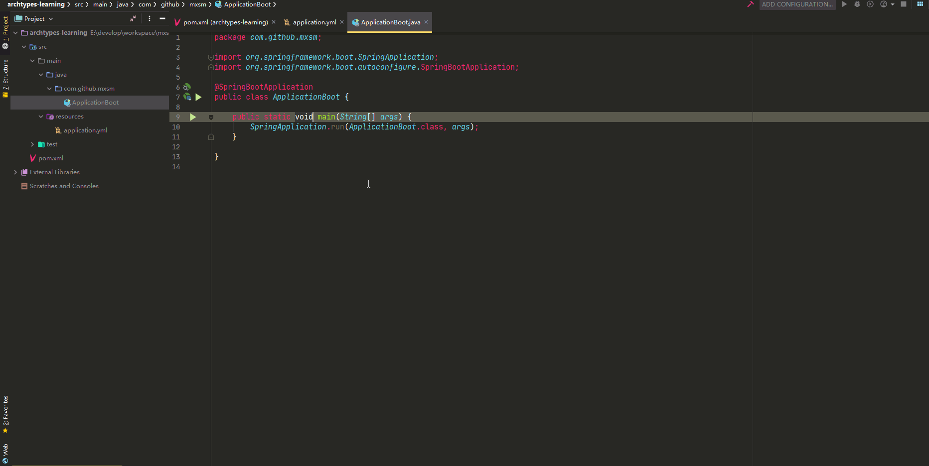 这里举个栗子:比如你搭建spring-boot项目简单的无非不是在pom文件中添加一些spring-boot的必须的依赖。那么你新建十个项目你就要添加十次。想想累不累烦不烦。所以maven archetype就是来解决这个问题的。那么我们来看一下怎么开发这样一个模板。然后倒入idea中在后续的过程中使用