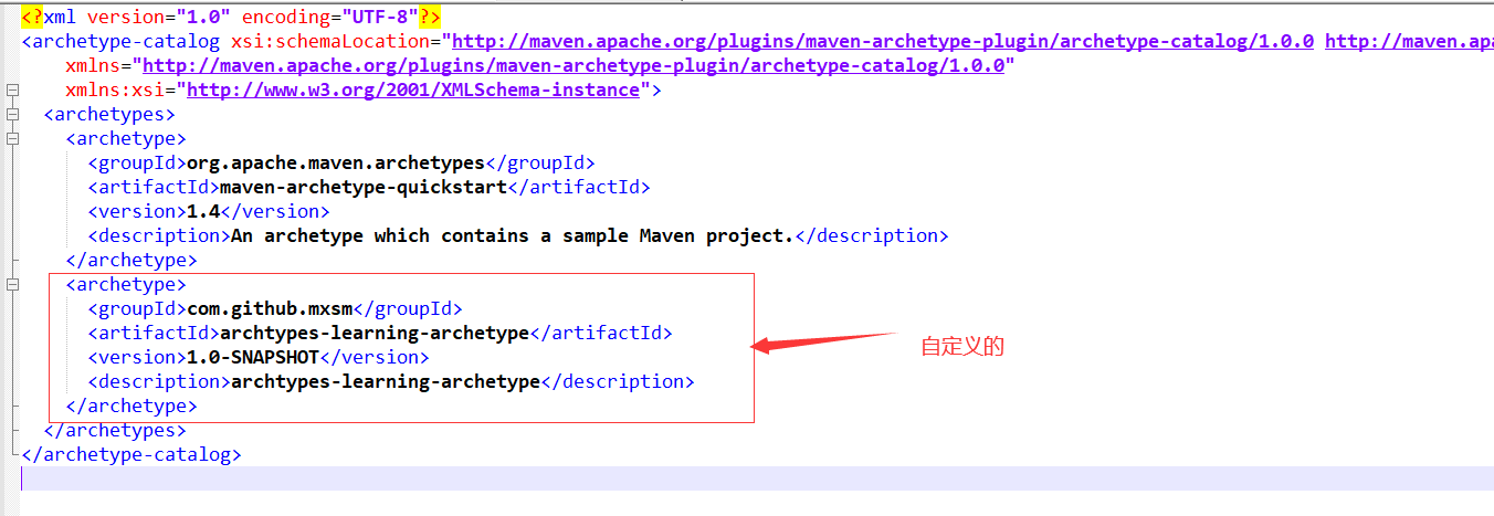 这个archtype在本地maven仓库的一个archetype-catalog.xml文件中可以看到: