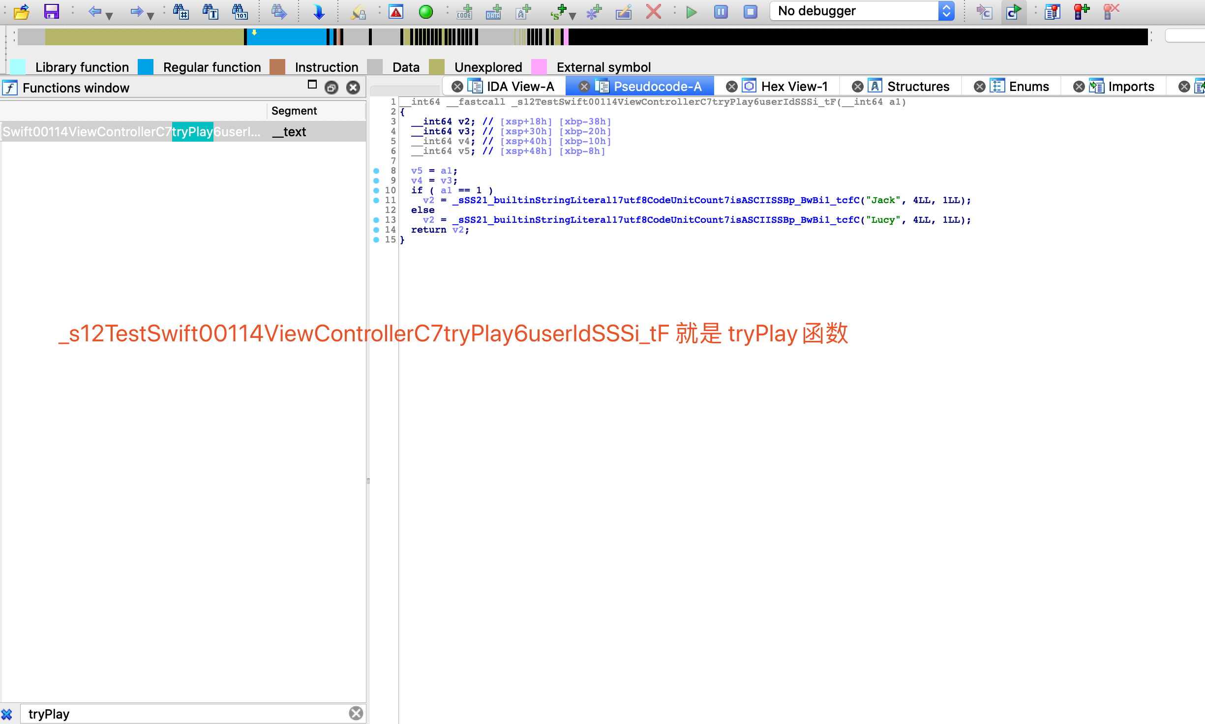 经过编译后,我们把TestSwift001这个APP的二进制文件放到 IDA 中看一下tryPlay函数变成了什么样子: