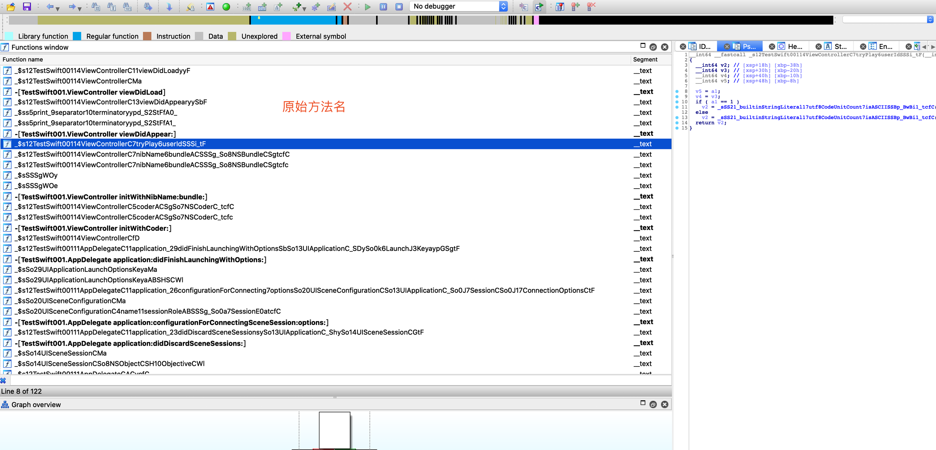 xcrun swift-demangle s12TestSwift00114ViewControllerC7tryPlay6userIdSSSi_tF特别注意的是,在ida中看到的函数名一般第一个字符是'_',我们在终端中要删除函数名前的'_'符号