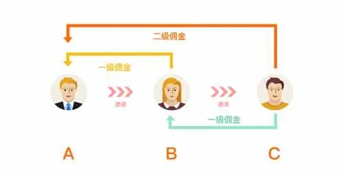 上图就能很好地诠释了二级分销裂变的链路,A邀请B购买,A获得一级返利;B再把活动分享给C购买,B就获得C的一级返利,A也能活动C的二级返利。