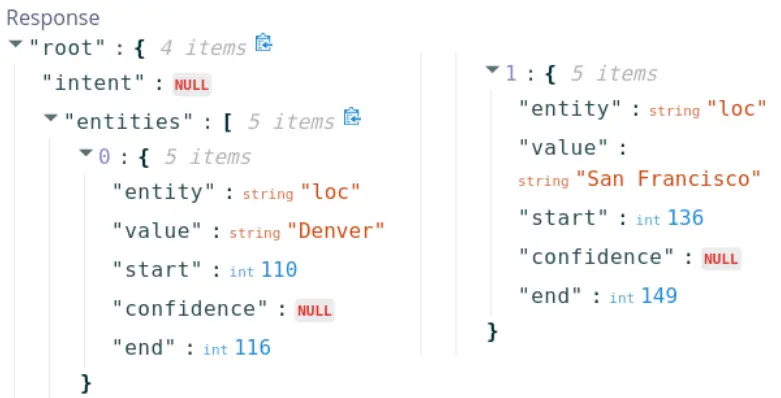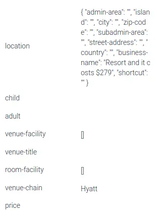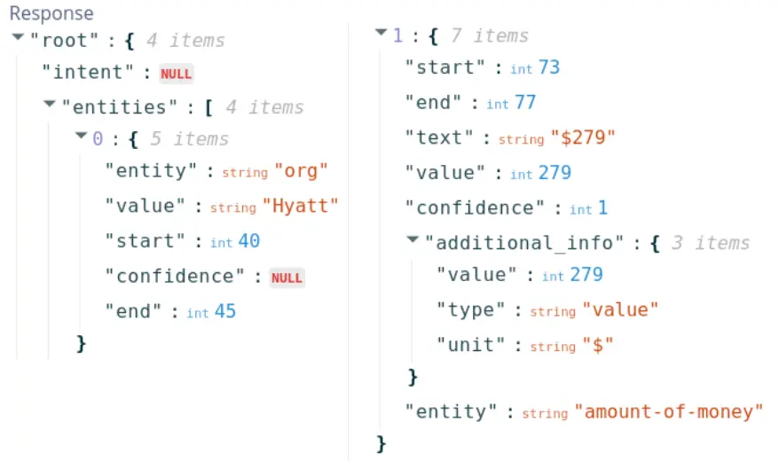 我们使用Dialogflow预先训练过的酒店预订机器人,这让我们自然地期望它的结果至少和StanfordNLP发现的一样好。不幸的是,情况并非如此,甚至连"$279"的价格也没有找到。它正确地将"Hyatt"归类为场地连锁,但错误地将其商业名称归类为"Resort and it costs $279"。日期也没有找到了。
