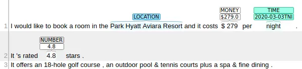 StanfordNLP做了更好的工作,发现"279美元"是钱,停留的时间和star的数量。不幸的是,我们的酒店也被归类为一个地点,而不是一个组织,它可能对某些应用程序起作用,但当用户希望自动转发到酒店网站时,这可能不起作用。它也不承认279美元的价格属于"per night",而将"night"作为日期返回。