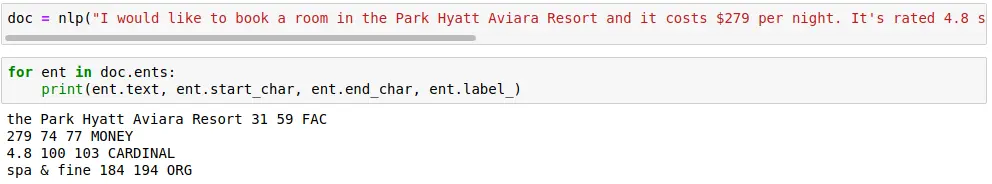 正如前面的例子所示,spaCy的表现也同样糟糕。我们的酒店"Park Hyatt Aviara Resort"被归类为设施(FAC),这并不完全正确,但"279"被正确归类为金钱。不幸的是,"spa & fine"被错误地视为一个组织。