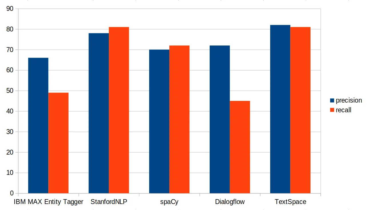 与其他四种解决方案相比,TextSpace的NER表现最好,紧随其后的是StanfordNLP。IBM的MAX实体标记器总体上令人失望。