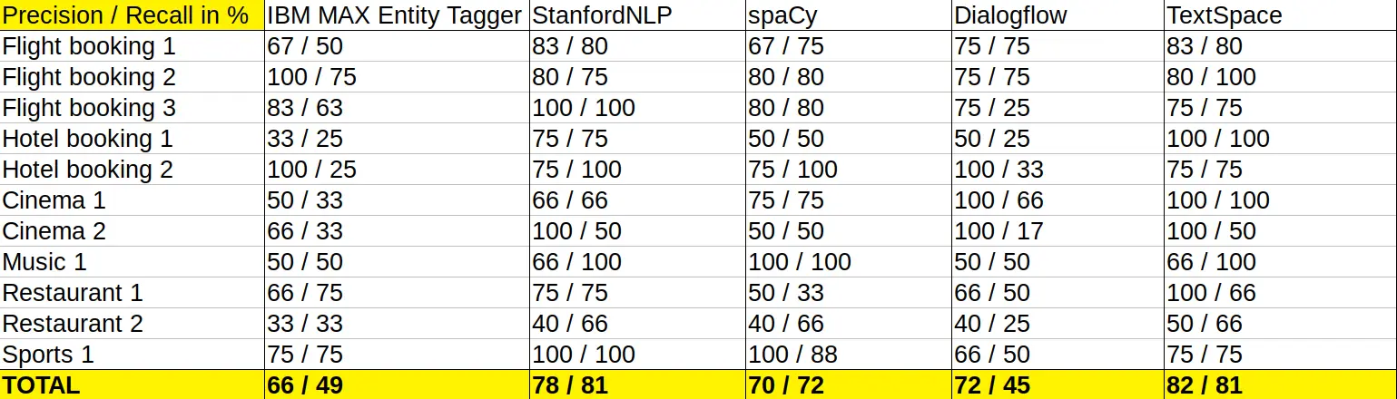 这个数据集中的句子可能在长度和包含的信息上有所不同,但是我们选择了其中包含大量实体的句子,因此我们可以根据最新的NER解决方案来区分优劣。我们测试集中的句子来自不同的领域,因为我们想看看我们在这篇文章中比较的解决方案有多灵活。请注意,这些示例中使用了Dialogflow聊天机器人,因此我们也希望Dialogflow在这些例子上能够执行得很好。